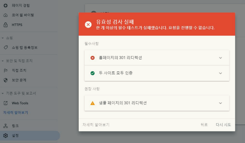 아래와 같이 홈페이지의 301 리디렉션, 유효성 검사 실패가 나왔습니다